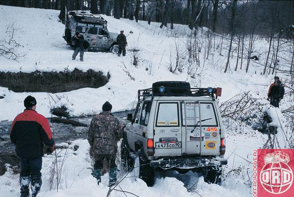 Первой на хрупкий лед спустилась по крутому берегу Toyota под стартовым номером 213. В мгновение ока ледяной панцирь оказался взломан, чистая речная вода окрасилась мутными потоками, а прибрежный снег стал наконец соответствовать названию мероприятия. С проездом по руслу особых проблем у «первопроходца» не возникло, а вот выбраться на сушу получилось не сразу – мокрые колеса категорически не хотели цепляться за укатанный снег. Но в конце концов упорство пилота увенчалось успехом, и с пятой попытки машина без лебедки выехала к заветному компостеру. Кстати, несмотря на то, что переправиться через речной рукав можно было в нескольких местах, по не вполне понятной причине большинство машин (за исключением выступавшего вне зачета экипажа прототипа на базе Jeep Cherokee) пошло на штурм именно вышеописанным путем. При этом они также старались по возможности обойтись без помощи лебедки. Вышло не у всех…