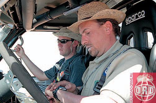 Следующий день (песчаная буря все продолжалась) участники начали с преодоления вертикального трехметрового уступа. Забраться туда можно было разве что на лебедке, зацепив наверху земляной якорь, однако быстрее всех на уступе оказался красный Patrol, у которого «электротягловое» устройство сгорело накануне вечером. Ребята использовали лебедочный якорь как выравнивающий плуг! Они впрягли в него свой автомобиль (читай, импровизированный бульдзер) и, пользуясь мягкостью грунта, за пару десятков заходов превратили стенку в наклонную плоскость, по которой и поднялись. После такой разминки участников ждал достаточно длинный навигационно-скоростной этап с финишем в лагере, куда все вернулись уже далеко затемно.