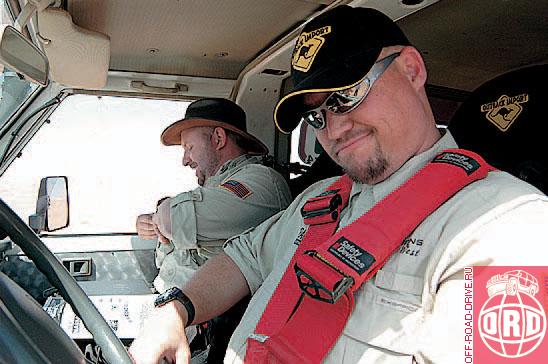 На следующее утро настала пора «веселых стартов» – коротких спецучастков и заданий с навигационными этапами. Началось все с песчаного триала. Размеченная на барханах трасса с трамплинами, уклонами и поворотами заканчивалась воротами на гребне высокого холма. Большинство стартовало на авось, даже не сдув колеса. Результат можно было предположить заранее. Дополнительную пикантность ситуации придавал и тот факт, что несколько экипажей выбрали резину Simex, а, как известно, грязевой Simex в песке – это страшная сила. Стоит ошибиться с подачей газа, как испытанный грязевой боец Simex, взрывообразно поднимая в воздух миллиарды песчинок, закапывается и намертво сажает машину.