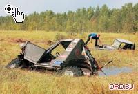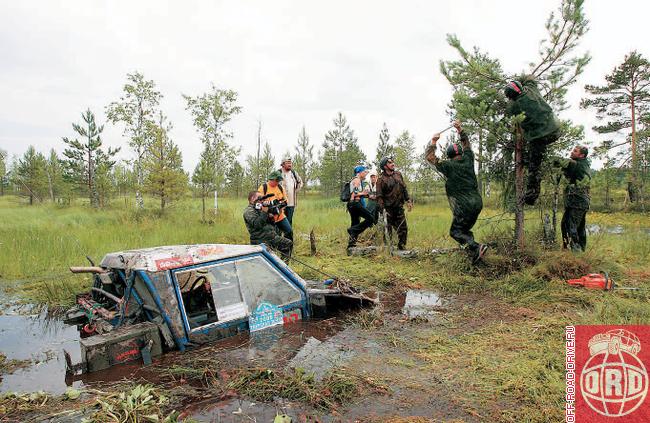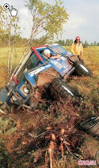 Болото называлось «Черничка». Но спортсменам было явно не до ягод. Точки находились примерно в ста метрах от берега, добираться до них нужно было по ковру мха толщиной около сорока сантиметров. Внизу – вода. Знаете, как красиво?! Делаешьшаг, а вокруг тебя метров на пять все ходуном ходит. Это если пешком, а теперь представьте, каково передвигаться по этому желе на машине весом под две тонны. Вот тут-то и начался настоящий праздник. Первые машины дошли до точек, но идущие следом прорвали мох и частично затонули. При этом они перекрыли дорогу возвращавшимся от точек. Машин было много, людей, соответственно, в два раза больше. И тут случилось то, чего не было на Чемпионате раньше и что вряд ли случится в обозримом будущем. Экипажи объединились в единуюкоманду и начали работать сообща! Не прошло нескольких часов, как большая часть машин снова оказалась на суше. Не обошлось и без осваивания новых методик. Например, несколько автомобилей пришлось лебедить, вращая через… крышу!!! Не поверите, но это был единственный способ удержать машину на поверхности изодранного в клочья мха. Другой экипаж воспользовался помощью технички, в спешке зацепив трос не за раму, а за мост, и, конечно же, сей узел моментально оторвался от автомобиля. Но на этом парни не успокоились – тросом передней лебедки (пустив его над каркасом безопасности) они притянули мост к автомобилю и, заведя трос технички за раму, повторили попытку. На этот раз не выдержал каркас безопасности и красиво сложился, став похожим на уши хорошо известного детям нашей страны Чебурашки.