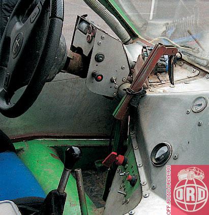 Еще одним интересным агрегатом на этом прототипе является механическая лебедка конструкции Алексея Гарагашьяна. Во-первых, она обеспечивает очень высокую скорость намотки троса, во-вторых, позволяет «помогать» колесами при использовании лебедки, в-третьих, имеется возможность выпускать трос не только вперед, но и петлей назад для работы через блок. Эта лебедка, как и многие другие конструкции Гарагашьяна, проста и при некоторых своих «странноватых» конструктивных особенностях обеспечивает отличные выходные характеристики. Так, скорость намотки при максимальных оборотах двигателя такова, что преодоление водных преград на лебедочной тяге зрители называли… глиссированием.