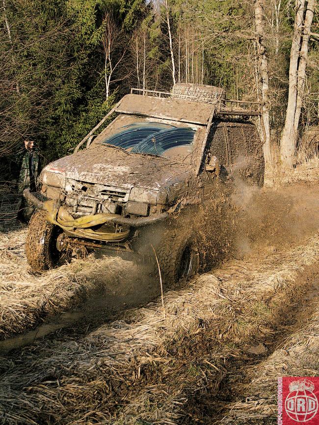 Первые километры были ознаменованы гулом протектора по асфальту – мы заезжаем сфиниша. Наша цель – примерно середина трассы, и участники, даже если разовьют околозвуковую скорость, все равно будут обязаны пройти мимо судейских машин. Сваливаемся на грунт. И сразу же начинается длинная просека. Судя по состоянию остатков снежного покрова, в этом году здесь никто еще не ездил. Что ж, будем первопроходцами. Isuzu Rodeo улетает вперед с невиданной скоростью, а наш Nissan Terrano автоматически оказывается в роли слабого звена. Несколько раз нас даже выдергивают тросом. Причем, делают это из таких удивительных позиций, которых несчастный автомобиль на своем веку, считай, и не видывал. А учитывая, что машина свежепокрашена… была. Удары веток сыпались как град на лакированные борта, а днище ползет по пням, скрытым в обломках льда. Но стоило только замаячить на горизонте болееменее приличной дороге, как горе сменилось окончательной бедой. Точнее, жесткая колея просеки сменилась вязкими глинистыми участками. Теперь в разряд слабого звена немедленно перешел Ford Maverick. Если в колее он выигрывал за счет портальных (это на чем, на Maverick?) мостов, то на «чаче» изношенный BF Goodrich AT банально забился и спасовал.
