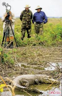 Вопреки широко распространенному заблуждению южноамериканский кайман (местные называют его «жекаре») - это не крокодил и даже не аллигатор. Кайманы - общее название трех родов пресмыкающихся {Caiman, Melanosuchus и Paleosuchus). От собственно аллигаторов они отличаются отсутствием костной перегородки в обонятельной полости и наличием костного брюшного панциря. Что же касается Пантанала, то плотность «каймано-населения» здесь просто поразительна. В это трудно поверить, но даже в самых труднодоступных местах амазонской сельвы, на реках, берега которых не знают толком, что такое след человека, вы не увидите такого скопления этих древних животных, которое можно часами наблюдать, стоя на одном из 124 мостов Транспантанейры. Кстати, как вы догадываетесь, охота в этих местах строжайшим образом запрещена.
