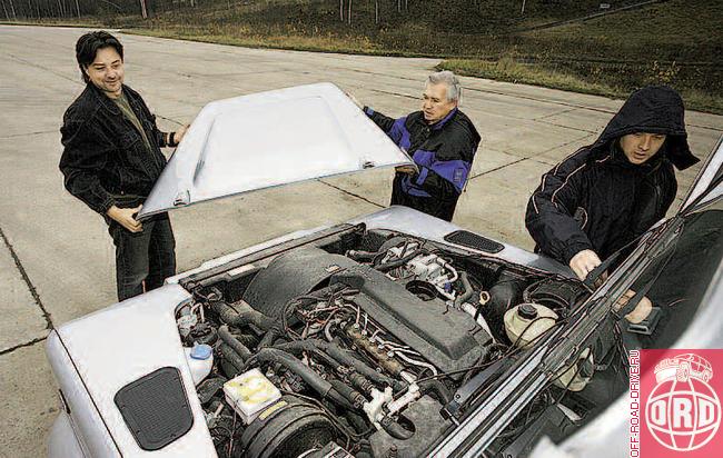 Народная молва не пришла к единому мнению относительно Defender. Кто-то говорит, что удобнее в обслуживании машины нет, кто-то ругает его на чем свет стоит за недоступность агрегатов и инструмента. Например, два человека могут снять изрядно потяжелевший (он стал стальным) капот буквально за несколько секунд. Это открывает невероятно простой доступ в моторный отсек, но... Установка капота на место заняла далеко не секунды и выявила необходимость в третьем участнике... Следующее упражнение - замена колеса. Здесь нам предстоит проверить работу штатного домкрата. Но для начала нужно найти баллонный ключ. В чехле домкрата обнаружить его не удалось. Поиски в углах и ящичках тоже успехом не увенчались. Неужели ТАМ? Итак, с приличным усилием сдергиваем подушку водительского сиденья... И действительно, в аккумуляторном отсеке висит наш «найденыш». Теперь дело за домкратом. И тут становится ясно: поднять на сколь-нибудь приличную высоту можно только переднее колесо. С задним хуже - выбранный до конца ход винта оторвал его от грунта лишь на пару сантиметров. И это еще на ровной поверхности при твердом грунте.