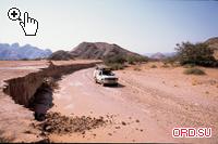 Река Хуарусиб находилась в 80 км к северу от нас, и, по слухам, в ней еще должна была быть вода. Если так, то это будет первая проточная вода с того момента, как мы пересекли Оранжевую. Выбравшись из долины Хоаниб, мы попали на бесконечные равнины африканской саванны. То тут то там у подножий невысоких холмов нам встречались пасущиеся стада ориксов и антилоп-прыгунов. Спустившись в долину Хуарусиб, мы действительно увидели текущую воду и поехали вдоль реки на запад, в сторону Берега Скелетов. Двигались, пока не достигли таблички «Частная собственность» и скучающего около нее гида. Но поскольку гид никаких восторгов по поводу нашего появления не проявил, а точнее вообще никак не отреагировал на наш приезд, мы развернули машину и отправились назад – вверх по течению реки. Вечерело, и тут мы нарушили правило, которое неукоснительно соблюдали во время нашего путешествия: никуда не ездить в темноте. Вскоре грунтовая колея закончилась, и начался засыпанный гравием грейдер. Ален вел машину, и я незаметно задремал. Проснулся я от визга тормозов и от того, что ремни безопасности впились в мое тело. Оказывается, Ален тоже задремал и пропустил 90-градусный поворот. К счастью, на нашем пути оказались только небольшой откос и кусты, в которые и вломился наш пикап. Мы решили, что это «звоночек».