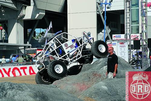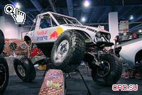 Непосредственно на парковке перед выставочным центром был устроен небольшой внедорожный полигончик, на котором потенциальные покупатели при желании могли проверить способности предоставленных производителями машин. Естественно, подвергнуть свою продукцию таким испытаниям решились далеко не все фирмы, и на трассе можно было увидеть только Jeep JK, Toyota FJCruiser и старые модели Suzuki. Но, безусловно, королями этих искусственных горок были специально построенные рок-багги вроде того, что вы видите на фотографии. |