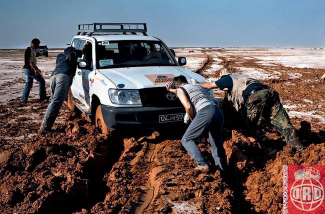 Что в имени тебе… его? Defender «перебирал» передачи вниз: четвертая, третья, вторая… Все – встали. Блокировки включены, и на пониженной с большим трудом выбираемся на менее вязкую поверхность. Цепляем лебедкой нашу «стопятку», вытаскиваем ее и подспускаем на всех машинах колеса. Можно ехать, но недолго... Стоило нам попасть в «водное пространство» (на карте солончаки обозначены голубым цветом), как наши пять машин (к группе добавилась TLC местного проводника) намертво застряли на границе солончака. Причем сделали это все примерно одновременно.