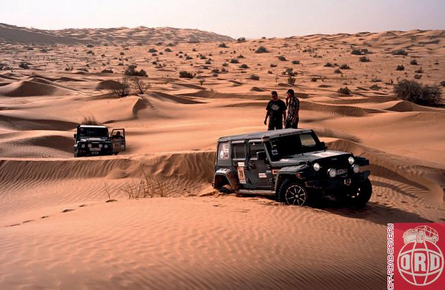 Соответственно, все пять автомобилей оказались на расстоянии друг от друга. Обидней всего было за Wrangler Sahara Геры Кузнецова, который остановился по собственной воле, увидев, что идущие впереди автомобили застряли. Тронуться он уже не смог, несмотря на спущенные «35-е» колеса. Пока авангард разрабатывал, а затем воплощал план спасения (который заключался в идее закопать сендтраки и выехать при помощи лебедки), арьергард в лице Максима Григорьева, Абдеразака Азузи и вашего покорного слуги начал собирать ветки и выстилать ими обратную «дорогу». Это сработало, и спустя примерно час наша TLC 105 выбралась из плена. Затем за нее «залебедился» Defender и тоже оказался на свободе. Тем временем вытолкали Wrangler, а после и остальных. Кстати, идея с закапыванием сендтраков в качестве «якорей» оказалась неудачной, а единственным автомобилем, который мог передвигаться по солончакам, оказался Jeep Wrangler Sahara (видимо, не зря его так назвали). А что, согласитесь, – поехать в Сахару на Sahara как минимум красиво.