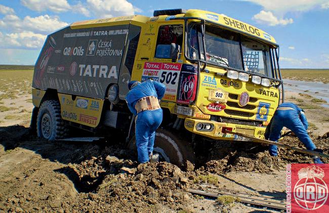 Таким образом стартовавшего первым Ханса Стейси очень быстро догнал Владимир Чагин и, казалось, уже ничто не может помешать лидеру камазовской команды с лучшим временем пересечь финиш специального участка. Но трассу заблокировали участники автомобильного зачета, сигналы прибора оповещения об обгоне Sentinel оставались без внимания, обойти на узкой дороге возможности не было, и лидеры грузового зачета уперлись в автомобильный. Все, кроме Стейси, на Man которого взорвались, причем почти одновременно, сразу два передних колеса. Ничего удивительного, если в такой жаре и на таких скоростях перегреть тормоза. В результате лучшее время оказалось у догнавших лидеров, вынужденных следовать в замедленном ритме за автомобильным зачетом: первое – у Марселя ван Влиета (Ginaf), а второе – у Жерара де Роя (Ginaf). И если 3-й и 4-й результат показали соответственно Мардеев и Кабиров, то первым уткнувшийся в пробку и первым финишировавший Чагин оказался седьмым. Да, обгоны часто становились камнем преткновения на этом ралли. По регламенту, если обгоняемый не уступил дорогу, то есть не принял в сторону, получив сигнал Sentinel, который не услышать и не увидеть невозможно в принципе, то за каждое нарушение первым 20 экипажам в общем зачете полагался штраф в 15 минут, а также пилотам из списка приоритета, тогда как остальные наказывались денежным – в 300 евро. Но, поскольку на такой трассе часто уступить дорогу было невозможно, в большинстве случаев обходилось без протестов.