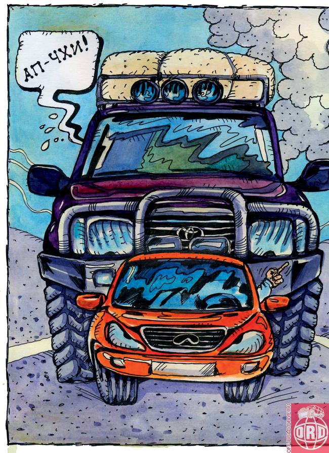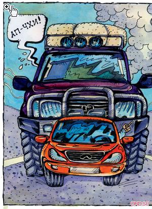 Идет снег, на дороге каша, а мы обуты в «мудовую» резину, в свете чего болтаемся по полосе, как вымя бегущей коровы. Звоню Диме — рандеву с его «дефом» назначено на Ленинградском шоссе. Он еще не выехал, штурмана ждет. Ну а мы тем временем уходим с кольца на Ленинградку. В этом месте традиционно небольшой затык в область. Потихонечку щемимся в левый ряд с включенным поворотником. Когда до завершения перестроения остается полряда, мужик на легковом Infiniti от скуки либо от проблем на сексуальной почве начинает истошно сигналить, наползая на нас. С интересом наблюдаем за этим процессом. Объехать он нас не может, потому как мы уже практически в ряду. Он дудит, бедный, аж надрывается. Макс доворачивает руль, и вот мы стоим в ряду. Но этот человек явно считает себя оскорбленным, перестраивается правее и, чуть обойдя нас, начинает прижимать к отбойнику. Вы следите за моей мыслью? Асфальтовый пузотер идет бортом на силовой бампер внедорожника. Я такого даже в кино не видел. «Макс, — говорю, — таким темпом мы его сейчас того…» В этот момент внучатый племянник Шумахера берет резко влево и влезает перед нами. В результате у нас — царапина на силовом бампере, у него — конкретно мятое заднее крыло. Останавливаемся, из Infiniti бойко выпрыгивают два мужичка и подрываются к нам. Правда, разглядев меня и Макса, они как-то сразу теряют темп, и к нам подходит только один. Я не буду передавать состоявшийся разговор, он был коротким и трехэтапным. Этап первый прошел под эгидой лозунга: «Вы зачем мне машину помяли?!», второй: «Блин, ну дайте хотя бы 500 евро» и, наконец, молчаливый заключительный этап осознания собственной тупизны. После этого мятая легковушка сорвалась с места и скрылась в потоке. Мы дождались ГАИ, порадовали инспектора своей историей и отправились на место встречи с Димой и Георгием, рассуждая на тему веселого начала поездки.