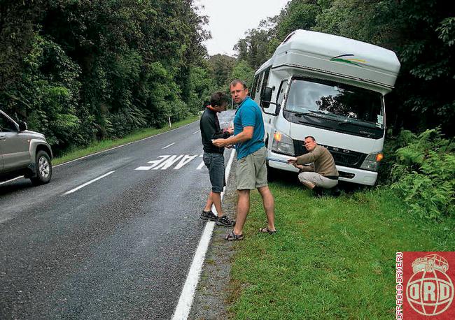 Напрасно, прождав, как говорится, у моря погоды, мы утерли горькие слезы разочарования и были вынуждены уехать, оставив мечту о знакомстве с ледником на дне пустого бокала, в котором четвертью часа раньше плескался глинтвейн. В качестве утешительного приза нам удалось насладиться спасением из грязевого плена размытой обочины дороги увязшего задним мостом кемпера с немецкой семьей внутри. Насладившись возней с тросом и получив в благодарность приглашение заехать в гости, когда будем в Германии (правда, адрес нам не дали), я, довольный и бодрый, покинул западный берег, направив автомобиль через перевал Хааст в город Ванака.