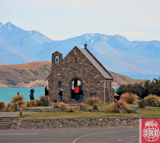 Мы приближались к «стране Макензи». Полные впечатлений, ближе к обеду прибыли на озеро Текапо, откуда открываются захватывающие виды на пики Южных Альп и гору Кука. Вода в озере имеет удивительный молочный цвет с синим отливом. Этот эффект создает так называемая горная мука — мелкие частицы скальных пород, суспензия, принесенная талой водой с ледника. На берегу стоит церковь Доброго Пастыря. Лососевая ферма дополнительно задержала нас на обеде.
