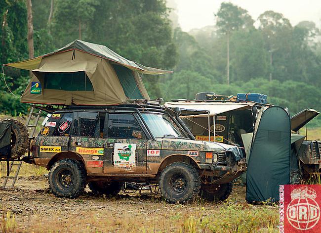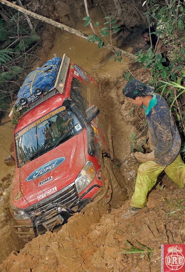 Природа встречает экспедицию проливным дождем. Натягиваем брезент между двумя машинами, чтобы сохранить клочок сухой земли, где можно приготовить ужин и поставить палатки. Потихоньку подтягиваются остальные автомобили. Дождь идет всю ночь, и мы почти уверены, что колеи впереди будут скользкими и трудными. Так и есть — плывем в грязи и вынуждены тормозить перед, казалось бы, совершенно безобидными препятствиями. Оползни образуют глубокие промоины, тут и там встречаются деревянные мостики, многие из которых буквально разваливаются на глазах. Используем деревья, чтобы восстановить переправы, иногда орудуем лебедками. Пока все идет как по маслу: в конце концов дождь прекратился и солнце потихоньку стало подсушивать землю, тем самым облегчая нам путь.