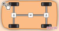 Силовой агрегат кроссовера Hyundai ix55 размещен спереди поперечно. В мостах установлены простые симметричные дифференциалы (Д). За распределение тяги между мостами отвечает многодисковая фрикционная муфта (М), управляемая электроникой. Картер муфты состыкован с картером заднего моста.