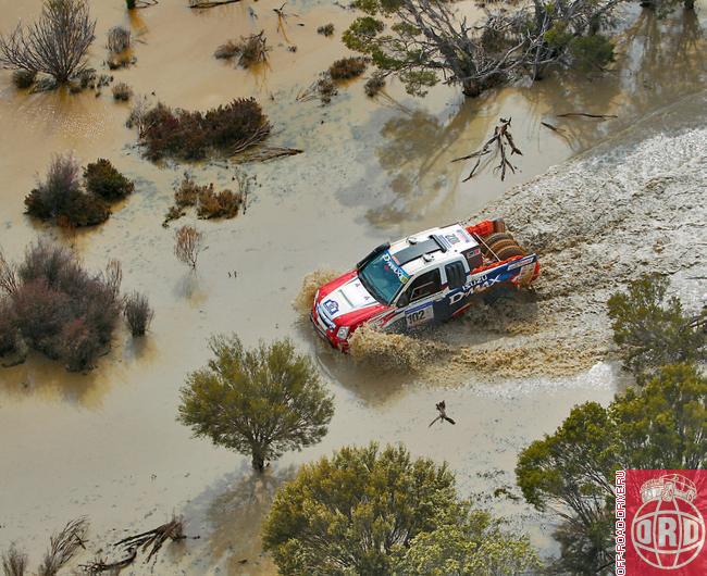 Показалось еще одно облако, сопровождаемое надрывным воем двигателя V8, работающего на 6000 оборотов в минуту. Это Holden (Chevy) Colorado, пилотируемый Крэйгом Лаундесом, чемпионом местного кузовного первенства V8 Supercar. Он впервые участвует во внедорожной гонке. Я всего в паре метров от дороги. Лаундес проносится мимо на полной скорости, не снимая ноги с педали газа перед двухфутовым прыжком в высоту прямо передо мной. Адреналин тотчас начинает хлестать по моим венам, и удушающие клубы коричневато-желтой бычьей пыли — перетертого в порошок песка — окрашивают небо и мою камеру в алые тона. Минуту спустя мимо «зарядил» Nissan Patrol, за ним — Isuzu D-Max, Mitsubishi Pajero и Грег Наулс на Hummer H2. Они только на второй сотне километров из двух с половиной тысяч. Прежде чем упаковать оборудование, мы ждем отставших и прыгаем в Land Cruiser. Снова начинаем нашу собственную гонку, цель которой — попасть к следующему месту фотосъемки до боевых машин. За семь дней этот эпизод повторится десятки раз.