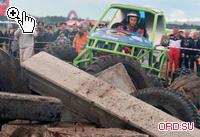 Тем временем дождь закончился, выглянуло солнце и обе секции быстро подсохли. Искусственный рельеф секции для модифицированных внедорожников успел претерпеть некоторые изменения. Один из бетонных блоков, по которому после расположенных в верхней точке конструкции ворот спортсмены спускались на землю, оказался сломан. Бетон не выдержал контакта с приземлившимся на него «Пауком-мечтой» Юрия Самодурова. А связанные вместе покрышки были развалены в разные стороны «Термитом» Сергея Ананова. Вас, возможно, удивят названия прототипов, но это единственные имена, которые у них есть, потому как машины не переделаны из серийных внедорожников, а построены с нуля опытнейшими спортивными конструкторами из России, Европы и Америки. Несмотря на то, что машины рассчитаны на жесточайшие условия эксплуатации, не обошлось без технических проблем. На болиде Сергея Ананова вышел из строя механизм переключения передач, а у Сергея Щетинина, выступавшего на прототипе Сергея Савенко, были постоянные трудности с включением межколесных блокировок — те попросту отказывались работать, поэтому прохождение секции для Сергея превращалось в сущее мучение, сопровождаемое набором штрафных баллов. Но меньше всех повезло Владимиру Беляеву, дебютанту соревнования, выступавшему на прототипе Гавинского. Владимир шел по трассе, показывая отличный результат, и практически без штрафных баллов взял трое ворот, но заключительные, четвертые оказались не по зубам главной паре заднего моста, и, отказавшись от атаки ворот, Владимир покинул секцию под скрежет развалившихся шестерней.