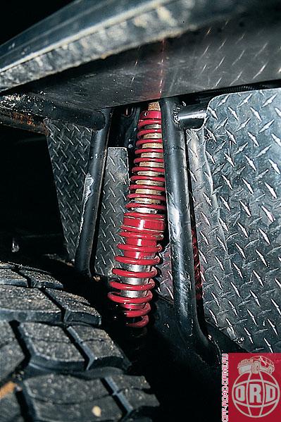 С целью снижения веса стальной кузов автомобиля был заменен на цельносварной алюминиевый (с каркасом безопасности). Приборная панель и остальная «отделка» салона выдержана в стиле классических американских гоночных автомобилей и напоминает хотрод. Обута машина в специальные шины фирмы Pro Comp 325/80 R16LT, надетые на диски с бедлоками. Подвеска выполнена на амортизаторных стойках фирмы RaceRunner (с пружинами и подпружинниками). Передний мост подвешен на двух продольных рычагах, один из которых вильчатый и обеспечивает восприятие реактивного момента и тяге Панара. Кстати, тут надо отметить, что и именитые заокеанские конструкторы тоже допускают серьезные просчеты. Так, например, болт, играющий роль оси шарнира, соединяющего части вильчатого рычага, при больших ходах подвески упирается в раму, а передние колеса при поворотах трутся об острый край усилителя рамы, кронштейны амортизаторов и бампер. Есть определенные проблемы и с жесткостью рамы, разрезанной в зоне стоек задней подвески.