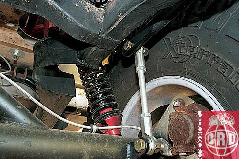 Когда же на стенде вывесился CJ7 Виталия Гавинского, то картина оказалась совершенно другая. Ходы подвески оказались просто гигантские, а в дополнение к ним... заметно деформировалась рама. Отрыв заднего колеса при подъеме двух площадок произошел на высоте 473 мм! Но и это еще не предел (обнаружилось, что проставка между пружинами задней стойки закусывает за корпус амортизатора и не дает пружине сжаться). При этом кузов автомобиля сохранял почти горизонтальное положение. То есть угловая жесткость подвесок если и отличается, то незначительно, что, на мой взгляд, неожиданно, учитывая тот факт, что сзади дополнительно установлен стабилизатор поперечной устойчивости.