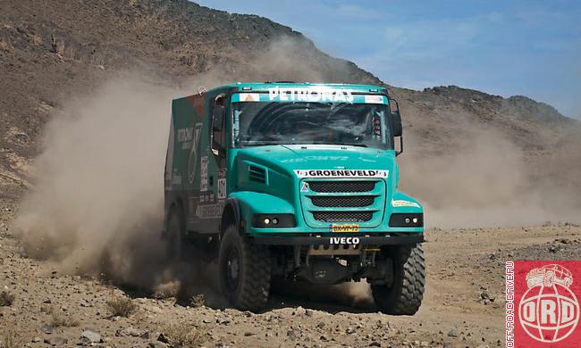 В грузовом зачете среди девяти экипажей особый интерес представляли главные конкуренты КамАЗа на предстоящем «Дакаре» — два зеленых Iveco, за рулем которых находились Жерар де Рой и Мики Биазон.