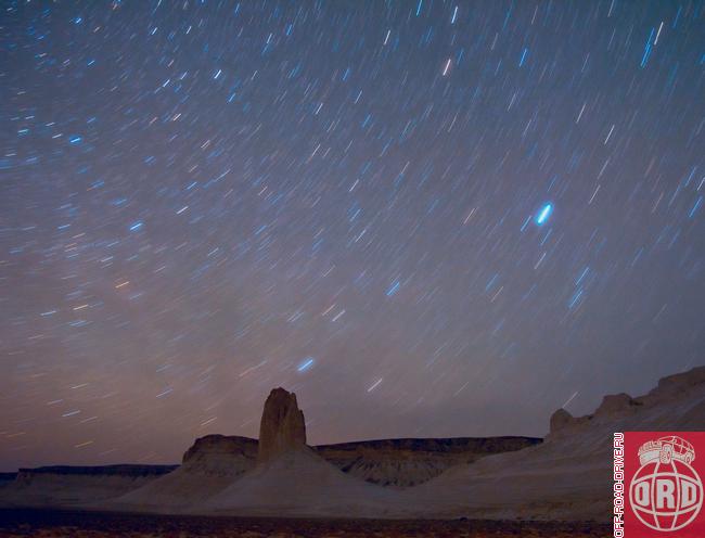 В Сай-Утёсе уже в темноте нас ждет заправка. По АЗС ползают жуки-скарабеи размером с теннисный мячик — видимо, сказались последствия гремевших тут 40 лет назад подземных ядерных испытаний. Опять доливаемся до верха и уходим в степь. В кромешной тьме едем на сор Тузбаир, находим уступ и встаем на ночевку. Сегодняшняя ночь прекрасна — стометровым чинком земля падает от палаток в пустоту.