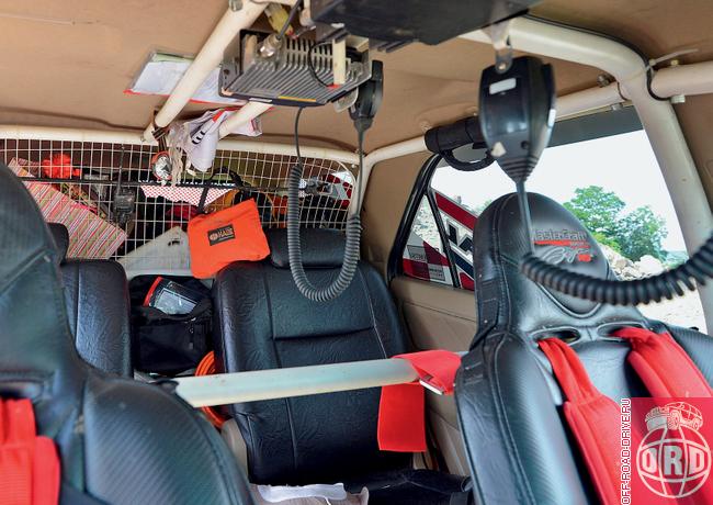 Впрочем, остается ведь и второй взгляд — в салон, через открытые двери. Автор проекта Герман Харсойо вовсе не желал расставаться с комфортом даже в самых экстремальных условиях, так что и внутреннее пространство машины претерпело немало изменений. Прежде всего, было решено снабдить машину каркасом безопасности, который в случае переворота защитил бы не только водителя и штурмана, но и пассажиров заднего ряда сидений. Для главных действующих лиц были приобретены спортивные сиденья Master Craft Baja RS. Эта модель имеет развитую боковую поддержку, но, тем не менее, рассчитана на то, что сидящий за рулем спортсмен не устанет и сохранит работоспособность в течение многих часов. Для двух дополнительных членов экипажа были установлены менее спортивные, но еще более комфортабельные («капитанские») сиденья. За фиксацию водителя и штурмана на своих местах отвечают четырехточечные ремни безопасности Crow. Что же касается обитателей «галерки», то было решено, что они обойдутся обычными трехточечными ремнями. Набор органов управления пополнился несколькими тумблерами, отвечающими за дополнительную светотехнику. На случай, если команде придет в голову отправиться в путешествие не в одиночку, на потолке салона, в центре каркаса безопасности, установили рацию для связи с другими машинами конвоя. Все сделанные в интерьере изменения выглядят аскетично и даже, я бы сказал, несколько примитивно. Но поверьте: все очень хорошо продумано и предельно функционально. Теперь Маманг и его команда действительно могли считать свой Fortuner «хорошо подготовленным».