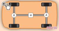 Силовой агрегат X1 размещен спереди продольно. Между колесами передней и задней осей крутящий момент распределяют простые симметричные дифференциалы (Д). На передний мост отбор мощности производит многодисковая фрикционная муфта с электронным управлением (М). Ее картер состыкован с картером коробки передач. Диски муфты работают в масле. Муфта замкнута практически во всех режимах движения. Однако инженеры предусмотрели и функцию размыкания фрикционов. Происходит это в трех случаях: при малых радиусах поворота машины и малых скоростях (например, такое бывает при парковке); при скоростях свыше 180 км/ч; при возникновении ярко выраженной недостаточной поворачиваемости. С ведомой обоймы муфты на приводной вал переднего моста тяга передается посредством зубчатой цепи (на легковых автомобилях BMW для этого используется зубчатая передача с паразитной шестеренкой). Исполнительный элемент муфты — электродвигатель, с ротором которого соединен червяк. Он вращает колесо, соединенное с обоймой шариковой муфты. Эта муфта и сжимает диски.