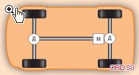 Силовой агрегат Infiniti JX35 размещен спереди поперечно. В мостах установлены простые симметричные дифференциалы (Д). За отбор мощности на задний мост отвечает многодисковая фрикционная муфта (М), управляемая электроникой. Диски муфты работают в масле, ее исполнительный элемент — электромагнит. Картер муфты агрегатирован с картером заднего моста.