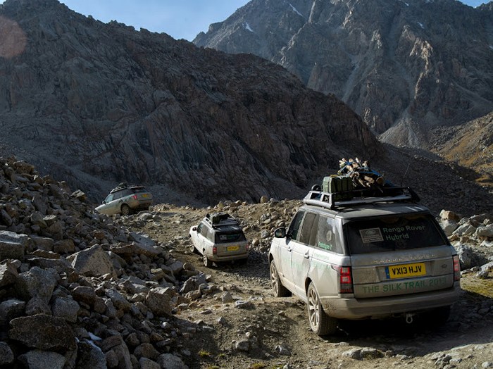 Из жарких пустынь Узбекистана экспедиция “Шелковый путь-2013” поднялась в высокие горы Киргизии и направилась в сторону Китая. Несмотря на небольшие задержки, вызванные проколами шин в коварной пустынной местности и прохождением границы в Узбекистане, колонна участников достигла величественного высокогорья Киргизии. Здесь гибридные Range Rover и их водители столкнулись с самыми тяжелыми испытаниями на этом этапе экспедиции. Направляясь к Ферганской горной гряде, автомобили в темноте преодолели узкие и разбитые грязевые тропы. До вершины горы, где должен быть разбит палаточный лагерь, оставалось около 20 км, но на преодоление такой короткой дистанции понадобилось несколько часов. В результате многочисленных дождей грунт оказался размыт, что вкупе с крутым рельефом добавило немало проблем Range Rover: преодолевать бездорожье пришлось медленно и осторожно, метр за метром.